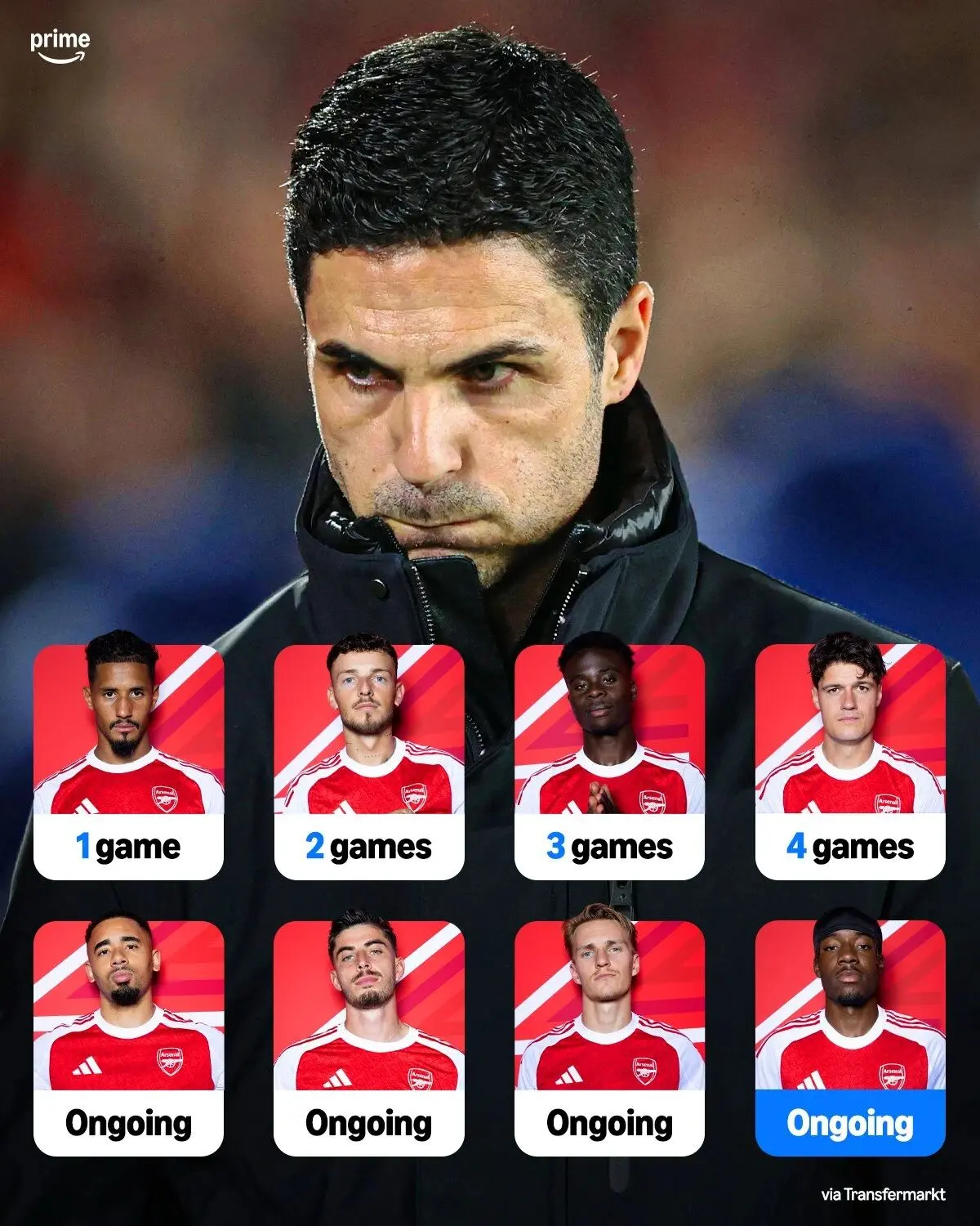 据悉,马杜埃凯预计将至少缺席11场阿森纳比赛(若球队在联赛杯继续前进,场次可能更多)。这段赛程包括: